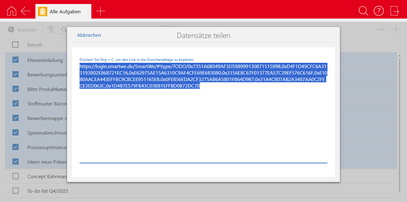 Die URL können Sie via E-Mail oder andere Kommunikationsprogramme mit anderen SmartWe-Benutzern teilen. Wenn ein anderer Benutzer auf die URL klickt, öffnet sich SmartWe mit einer Liste der geteilten Datensätze. Dabei werden die individuellen Rechte der jeweiligen Benutzer berücksichtigt und es werden nur die Datensätze angezeigt, auf die ausreichende Rechte vorliegen.