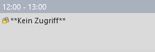 Persönlich | Wenn das Fremdzugriffsrecht Persönlich aktiviert ist, dürfen nur Zugriffsberechtigte Benutzer auf diesen Datensatz zugreifen. Ein Termin mit dem Fremdzugriffsrecht Persönlich wird für Benutzer mit Fremdzugriff trotzdem im Kalender angezeigt, jedoch sind bis auf Start und Ende keine Daten sichtbar. Anstelle des Betreffs wird ** Kein Zugriff ** angezeigt. |