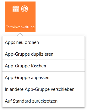 App duplizieren | Legt eine Kopie der gewählten App-Kachel an. Diese Funktion ist z. B. dann hilfreich, wenn Sie gerne mit verschiedenen App-Gruppen arbeiten und bestimmte Apps in mehreren App-Gruppen ablegen möchten. Eine duplizierte App wird auf der gleichen Ebene wie die originale App abgelegt und kann dann in die gewünschte App-Gruppe verschoben werden. Hinweis Die App selbst wird nicht dupliziert, sondern nur die Kachel zum Aufrufen der App. |