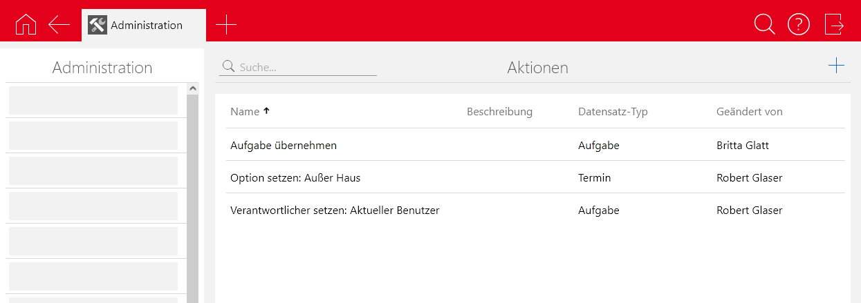 Suche | Im Feld Suche können Sie den Namen der gewünschten Aktion eingeben, um diese in der Liste zu suchen. |