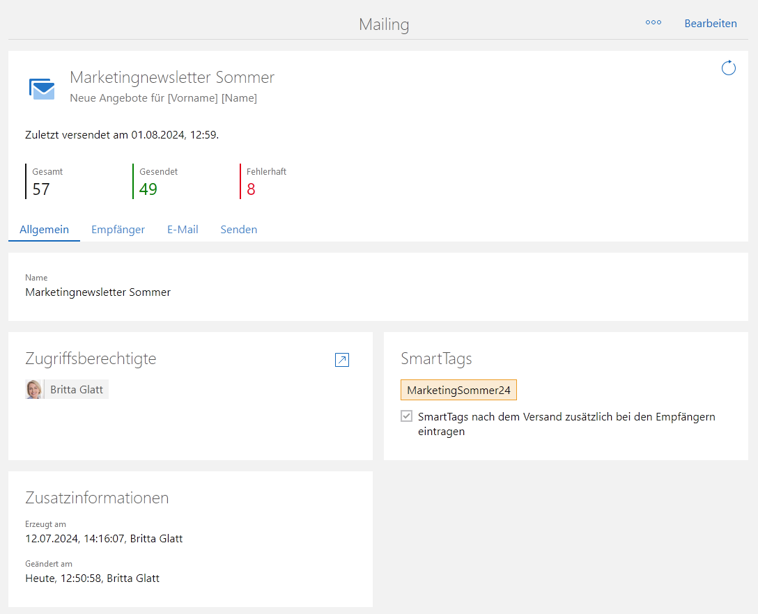 Nach dem Versand eines Mailings lassen sich nur noch die Daten im Bereich Allgemein und Empfänger anpassen, alle anderen Daten sind für die Bearbeitung gesperrt.