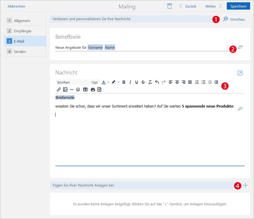 Platzhalter können Sie in den Betreff und in den Nachrichtentext einfügen. Mithilfe der Platzhalter gestalten Sie personalisierte E-Mails.
