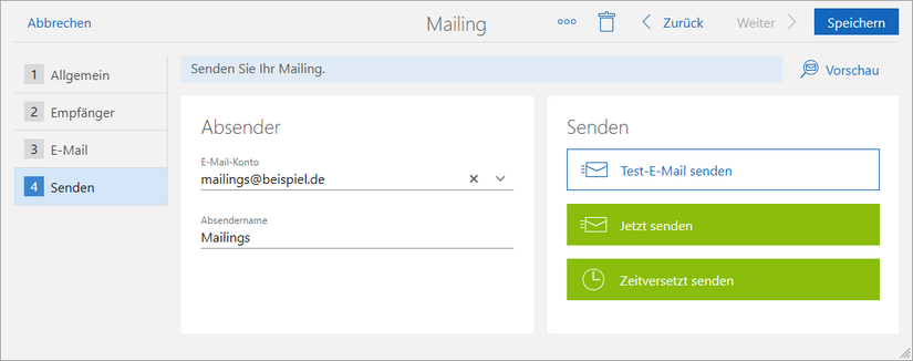Damit Sie ein Mailing senden können, muss ein E-Mail-Konto für den Versand eingerichtet sein. Das E-Mail-Konto können Sie in der App Einstellungen einrichten.
