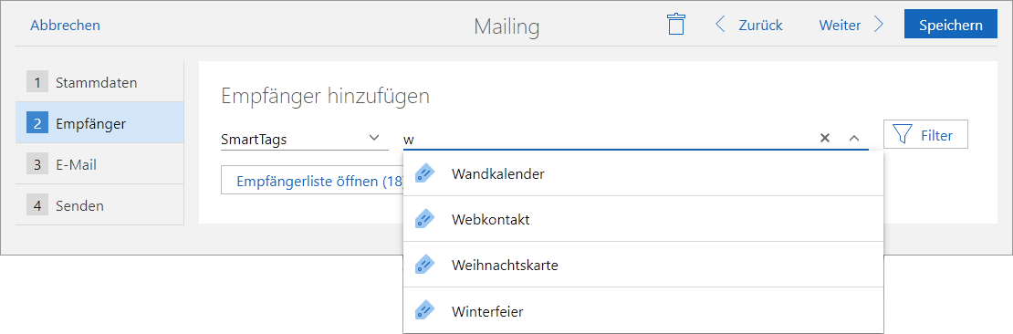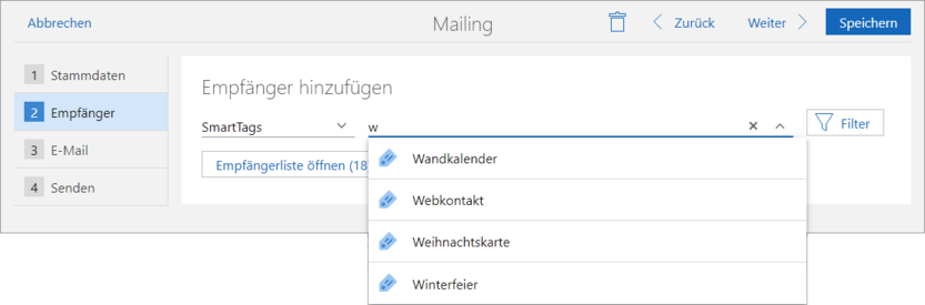 Diese Methode ist ideal, wenn Sie bestimmte SmartTags festgelegt haben, anhand dieser Sie die Empfänger für Mailings verwalten.
