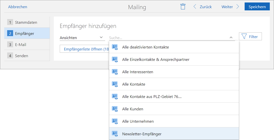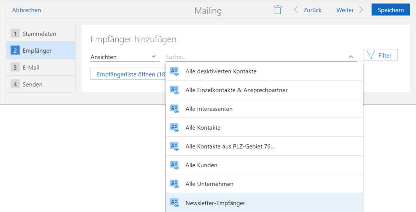- Die Kontakte aus der Ansicht werden zur Empfängerliste hinzugefügt.