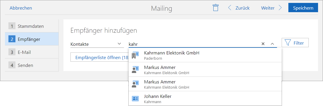 Diese Methode ist ideal, wenn Sie ein Mailing für nur wenige einzelne Empfänger erstellen möchten. Auch wenn Sie bereits eine Empfängerliste über eine der anderen Optionen erstellt haben und zusätzlich weitere Empfänger hinzufügen möchten, ist diese Methode gut geeignet.