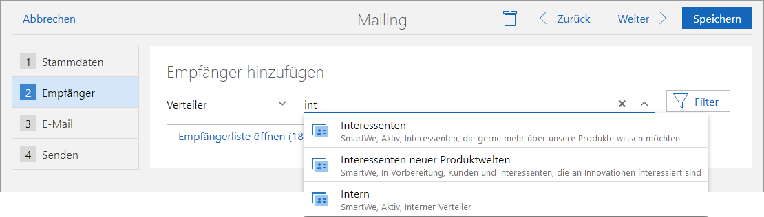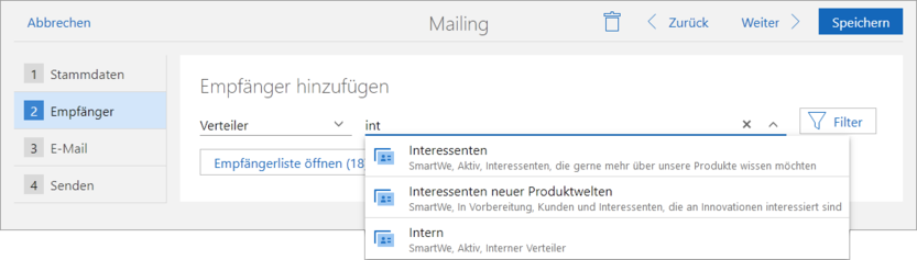 Legen Sie zuerst den Verteiler an, da in dem Bereich Empfänger eines Mailings kein Verteiler angelegt werden kann.