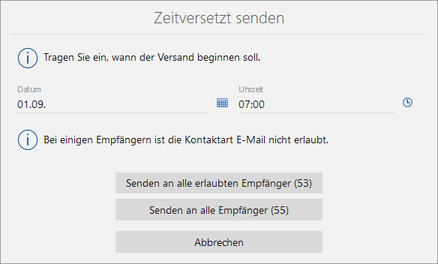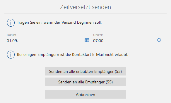 Mit der Schaltfläche Senden an alle Empfänger werden die Einstellungen für die erlaubte Kontaktart ignoriert. Verwenden Sie diese Schaltfläche nur, wenn Sie sich sicher sind, dass alle Empfänger das Mailing erhalten möchten.