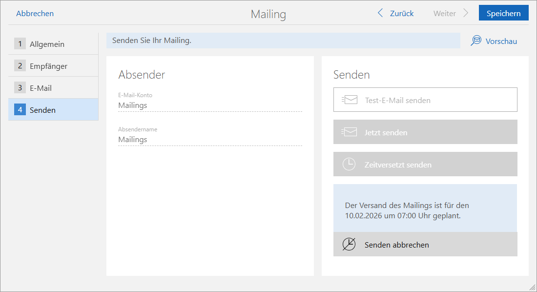 Nachdem Sie die Einstellungen vorgenommen haben, wird der Versand vorbereitet. Das Mailing wird zum angegebenen Zeitpunkt versendet. Nach dem Versand des Mailings wird eine E-Mail mit einer Zusammenfassung der Informationen zum Versand an die E-Mail-Adresse des Absenders gesendet.