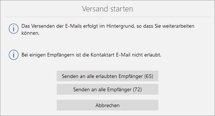 Nach dem Klick auf Jetzt senden wird automatisch geprüft, ob die Kontaktart E-Mail für alle eingetragene Empfänger erlaubt ist. Im Fenster Versand starten sehen Sie das Ergebnis dieser Prüfung.