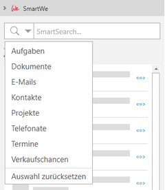 SmartSearch | Mithilfe der SmartSearch können Sie SmartWe durchsuchen. In der Standardeinstellung werden alle Datensatz-Typen durchsucht, die von der SmartSearch berücksichtigt werden. Sie können die Suche auf einen Datensatz-Typ beschränken, indem Sie auf die Schaltfläche vor dem Suchfeld klicken und den gewünschten Datensatz-Typ wählen. Wenn ein Datensatz-Typ gewählt wurde, erkennen Sie dies an dem Symbol des Datensatz-Typs, das vor dem Suchfeld angezeigt wird. Mit Auswahl zurücksetzen entfernen Sie Ihre Auswahl und durchsuchen wieder alle Datensatz-Typen, die von der SmartSearch berücksichtigt werden. Welche Datensatz-Typen und Felder von der SmartSearch berücksichtigt werden, können Sie auf der folgenden Seite nachlesen: | |