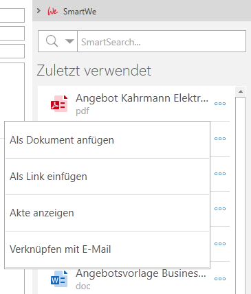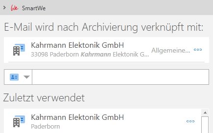 Verknüpfen mit E-Mail | Beim Versenden der E-Mail wird die E-Mail in SmartWe archiviert und mit dem gewählten Datensatz verknüpft. Nachdem Sie diese Funktion gewählt haben, wird der Datensatz oben in der Sidebar angezeigt. Im Aktionsmenü des Datensatzes stehen folgende Funktionen zur Verfügung: