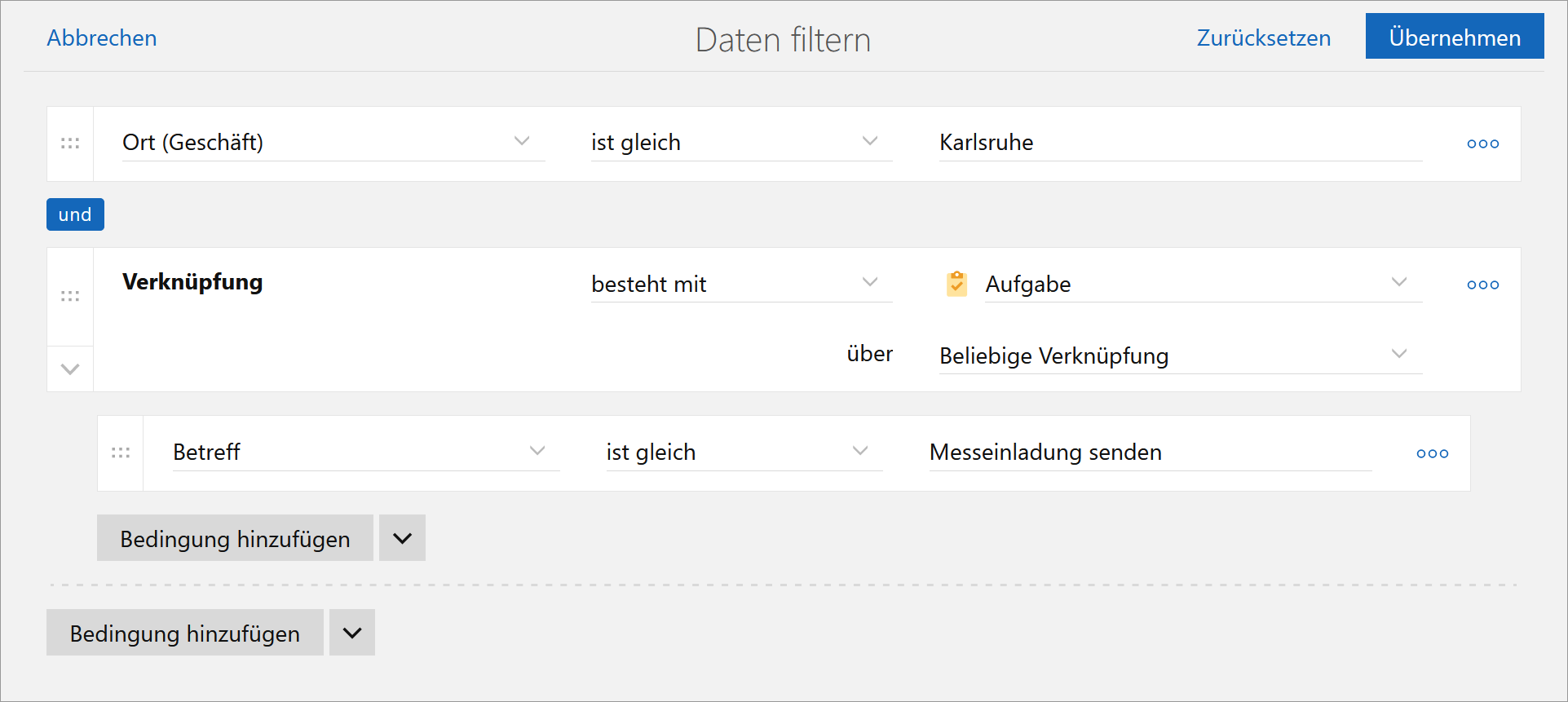 Mithilfe des Filters können Sie nicht nur Felder des aktuell geöffneten Datensatz-Typs filtern, sondern auch die Felder verknüpfter Datensätze.
