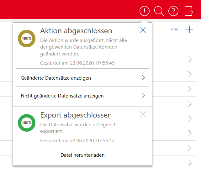 Die Statusinformationen zu allen Hintergrundaktionen werden im Kopfbereich von SmartWe angezeigt. Hintergrundaktionen sind z. B. Exporte, die im Hintergrund ausgeführt werden. Auch weitere Aktionen wie die gleichzeitige Änderung mehrerer Datensätze sind Hintergrundaktionen.