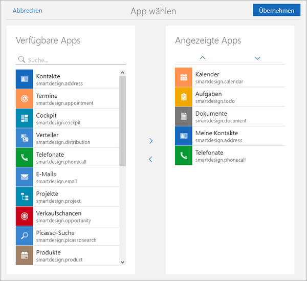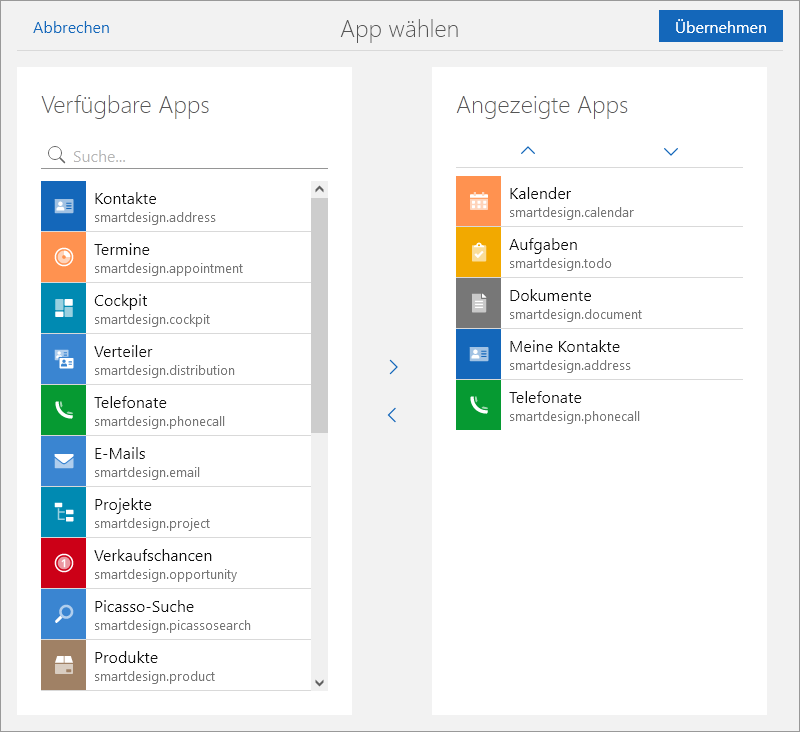 Im Bereich Angezeigte Apps sehen Sie die Apps, die beim Start von SmartWe automatisch geöffnet werden sollen. Sie können die Reihenfolge dieser Apps mithilfe der Schaltflächen oder via Drag & Drop ändern. Die Apps werden in der angezeigten Reihenfolge geöffnet.