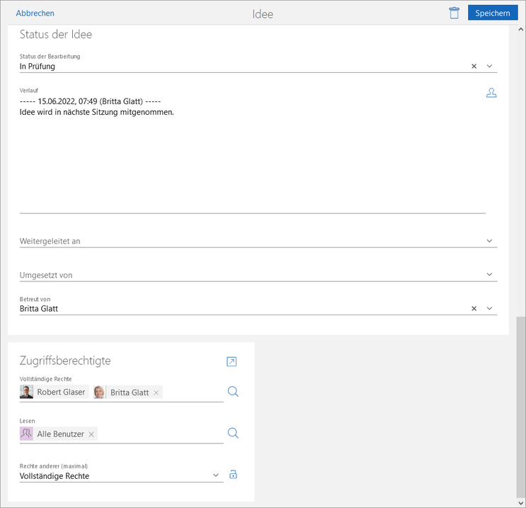 Betreut von | In diesem Feld wählen Sie den Benutzer, der die Idee betreut. |