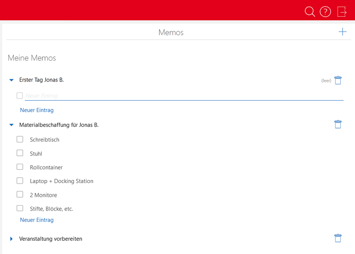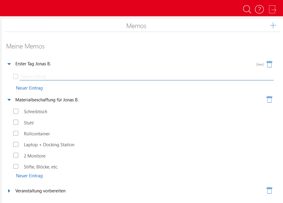 Memo löschen | Mit der Schaltfläche rechts von der Bezeichnung eines Memos löschen Sie das Memo inklusive aller Einträge vollständig. Das Memo wird sofort gelöscht und kann nicht wiederhergestellt werden. |