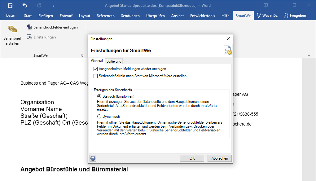 In Microsoft Word können Sie verschiedene Einstellungen für das Add-In festlegen. Diese Einstellungen gelten für alle Serienbriefe, die Sie mit dem Add-In bearbeiten.