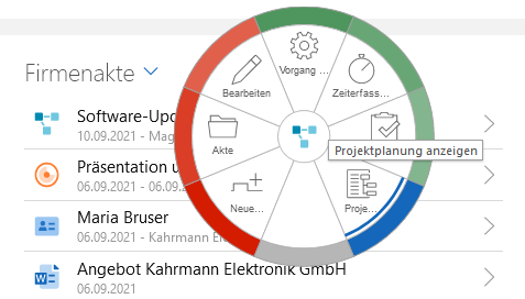 Sie öffnen die Projektplanung mit dem Radialmenü oder im Aktionsmenü eines Projekts.