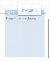 - In der Wochenansicht können Sie einen Datensatz in eine andere Woche verschieben. Wenn Sie in der Wochensicht einen Datensatz per Drag & Drop bewegen möchten, werden rechts und links Schaltflächen mit den Bezeichnungen der jeweiligen Kalenderwoche angezeigt. Zeigen Sie mit weiterhin gedrückter Maustaste auf eine dieser Schaltflächen, bis die jeweilige Kalenderwoche geöffnet wird. Sie können anschließend den Datensatz in dieser Kalenderwoche platzieren oder auf die gleiche Weise weitere Kalenderwochen vor- oder zurückblättern.