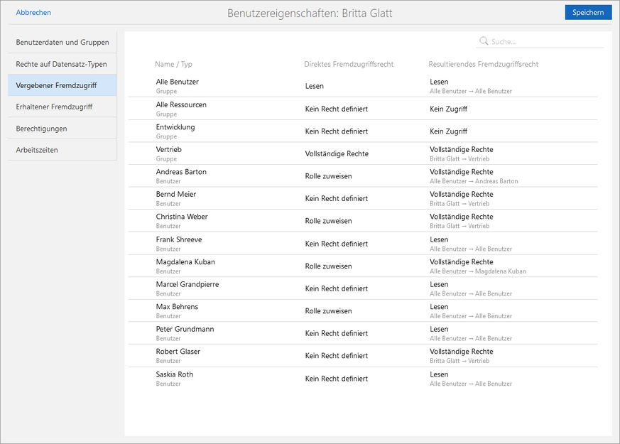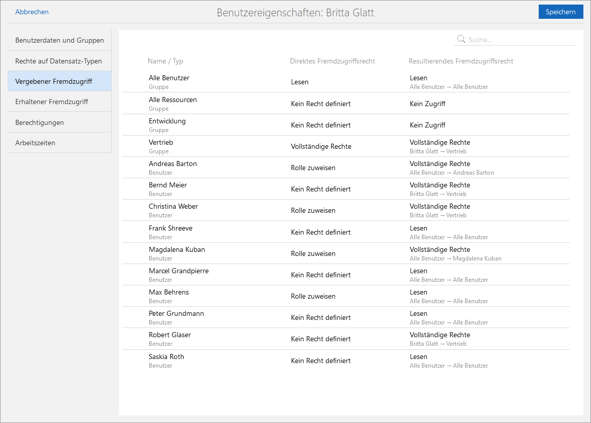 In der Spalte Resultierendes Fremdzugriffsrecht können Sie prüfen, welches Fremdzugriffsrecht für den gewählten Benutzer gilt. Unter dem Fremdzugriffsrecht sehen Sie, in welche Richtung das Fremdzugriffsrecht gilt.