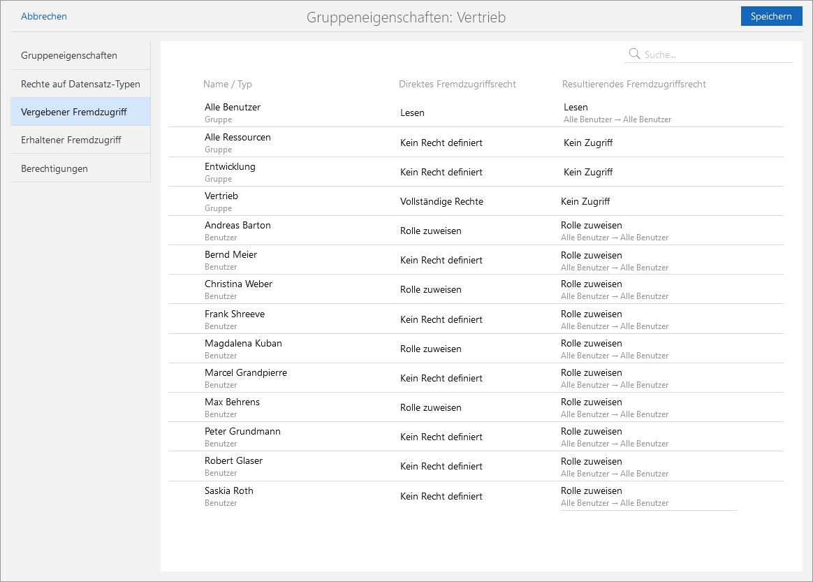 In der Spalte Resultierendes Fremdzugriffsrecht können Sie prüfen, welches Fremdzugriffsrecht für die gewählte Gruppe gilt. Unter dem Fremdzugriffsrecht sehen Sie, in welche Richtung das Fremdzugriffsrecht gilt.