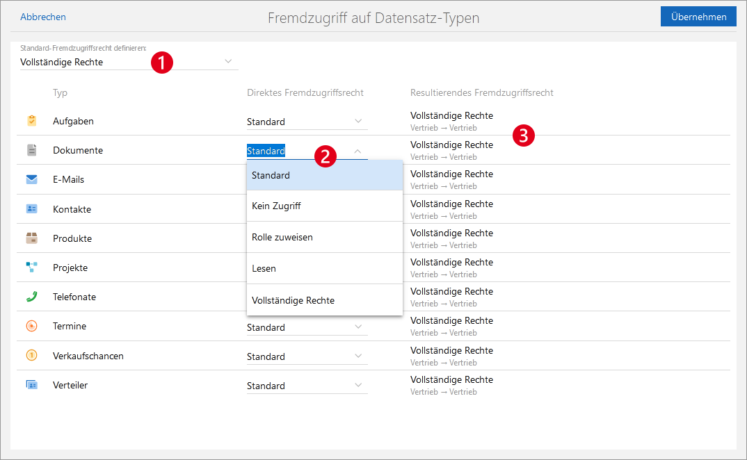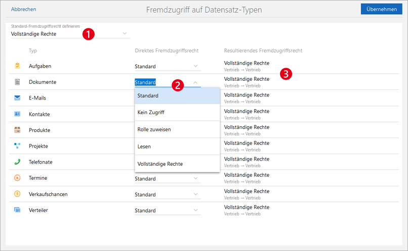 Ein individuelles Fremdzugriffsrecht können Sie einstellen, indem Sie einen anderen Wert für den gewünschten Datensatz-Typ wählen.