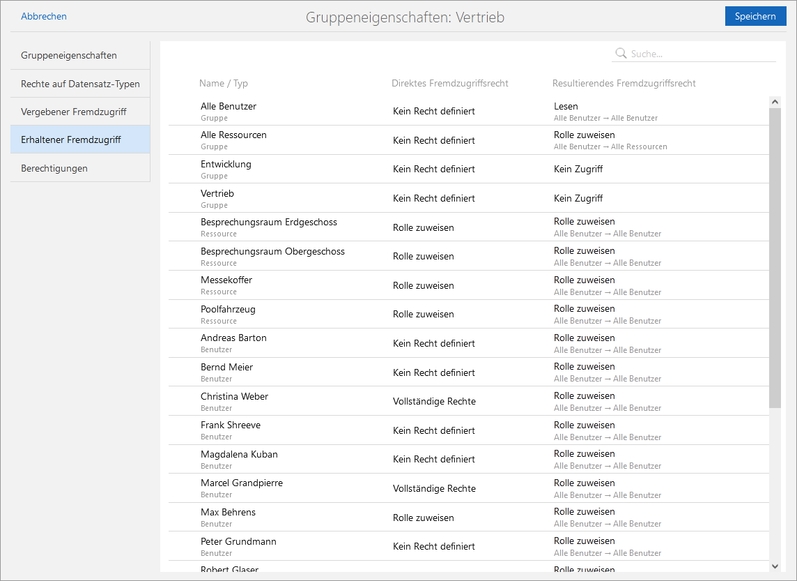 - Auf der Seite Erhaltener Fremdzugriff stellen Sie ein, welche Fremdzugriffsrechte die Gruppe von anderen Benutzer, Gruppen oder Ressourcen erhalten soll. Die Fremdzugriffsrechte auf Ressourcen können Sie nur hier einstellen.