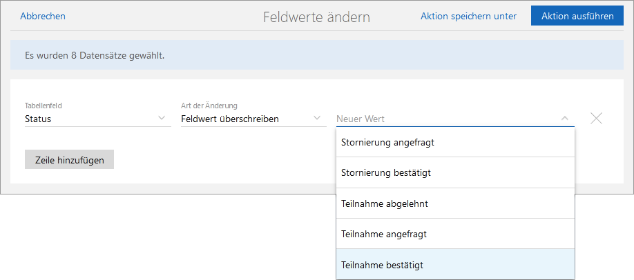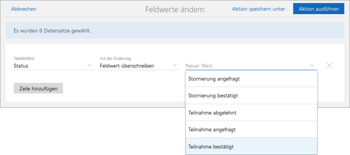 Mithilfe der Aktion Feldwerte ändern können Sie mehrere Anmeldungen gleichzeitig bearbeiten. Auf diese Weise können Sie z. B. für alle angefragten Anmeldungen den Status der Anmeldungen auf Teilnahme bestätigt setzen und die Anmeldungen somit gesammelt freigeben.