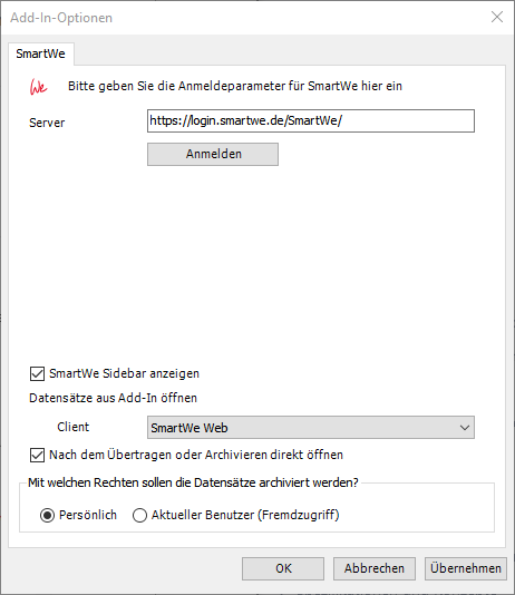 Nach dem Übertragen oder Archivieren direkt öffnen | Wenn Sie diese Option aktivieren, dann wird der entsprechende Datensatz nach dem Übertragen oder Archivieren der Daten sofort im gewählten Client geöffnet. Wenn SmartWe als Client eingestellt ist, wird der Datensatz in einem neuen Tab des Browsers geöffnet. Diese Option gilt sowohl für das Archivieren von E-Mails als auch für das Übertragen von Aufgaben, Terminen oder Kontakten. |