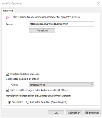 Wenn Sie das SmartWe Add-In zum ersten Mal ausführen, müssen Sie Ihre Anmeldeinformationen eintragen, damit Microsoft Outlook eine Verbindung zu SmartWe aufbauen kann.