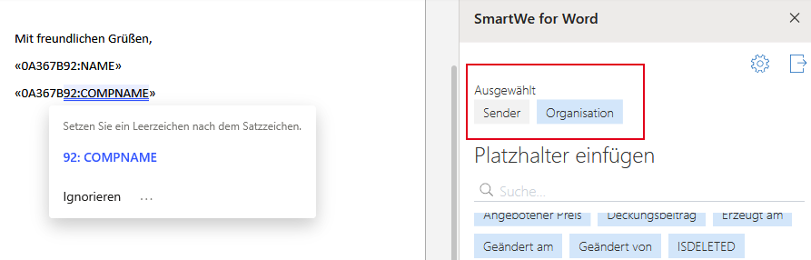 - In der SmartWe-Sidebar werden die Felder des für die Vorlage eingestellten Datensatz-Typs geladen. Zusätzlich werden Felder mit Informationen zum Absender geladen. Wenn für den Datensatz-Typ Verknüpfungsarten mit der Kardinalität 1:1 angelegt sind, werden auch diese Verknüpfungsarten angezeigt.