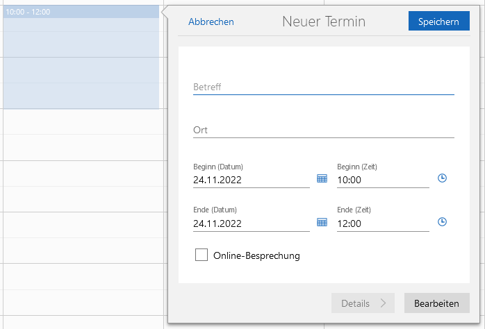 - Legen Sie einen neuen Termin an oder öffnen Sie den Termin, für den Sie eine Online-Besprechung anlegen möchten.
