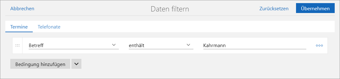 - Sie filtern jetzt die Termine nach den gewählten Kriterien. Wenn Sie jetzt die Änderungen übernehmen würden, würde der Filter auf Termine bereits angewendet. Für die Telefonate ist jedoch noch kein Filter festgelegt, somit würden alle Telefonate anzeigt werden.