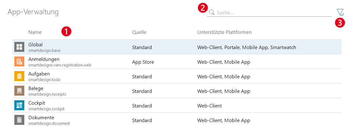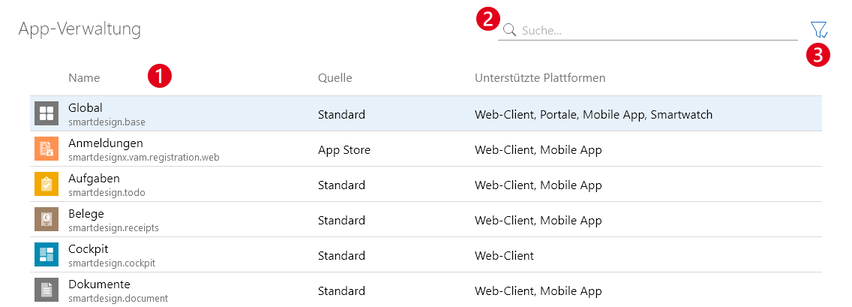 ❷ | Suche | Mit der Suche können Sie sowohl nach dem Anzeigenamen der App als auch nach dem technischen Namen suchen. Gefunden werden nur die Apps, die in der Tabelle angezeigt werden. Prüfen Sie die Filtereinstellungen, falls Sie die gewünschte App nicht finden. |