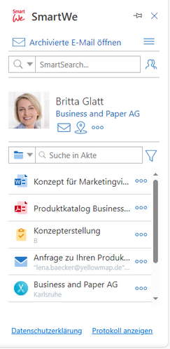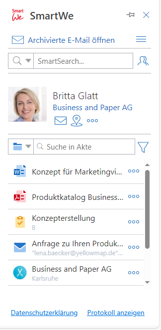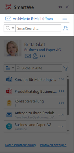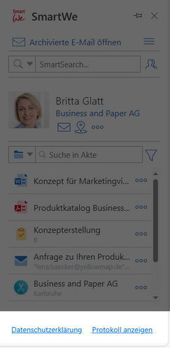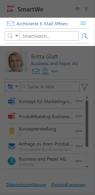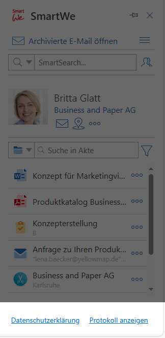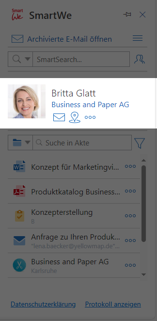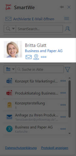 Wenn die aktuell geöffnete E-Mail einem Kontakt in SmartWe zugeordnet werden kann, wird die Visitenkarte dieses Kontakts angezeigt.