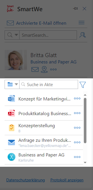 Die angezeigte Akte gehört zu dem Kontakt, dessen Visitenkarte gerade in der Sidebar geöffnet ist.