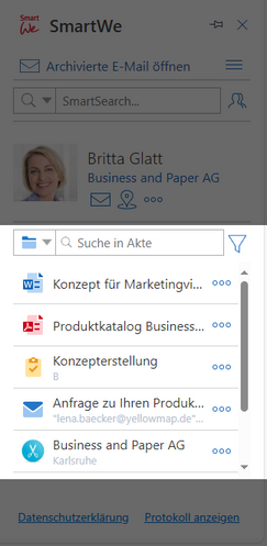 Wenn Sie über die SmartSearch in der Sidebar einen anderen Datensatz-Typ geöffnet haben, z. B. ein Dokument, wird an dieser Stelle die Datensatzkarte angezeigt. Dabei handelt es sich um eine Zusammenfassung wichtiger Daten, vergleichbar mit der Visitenkarte eines Kontakts.