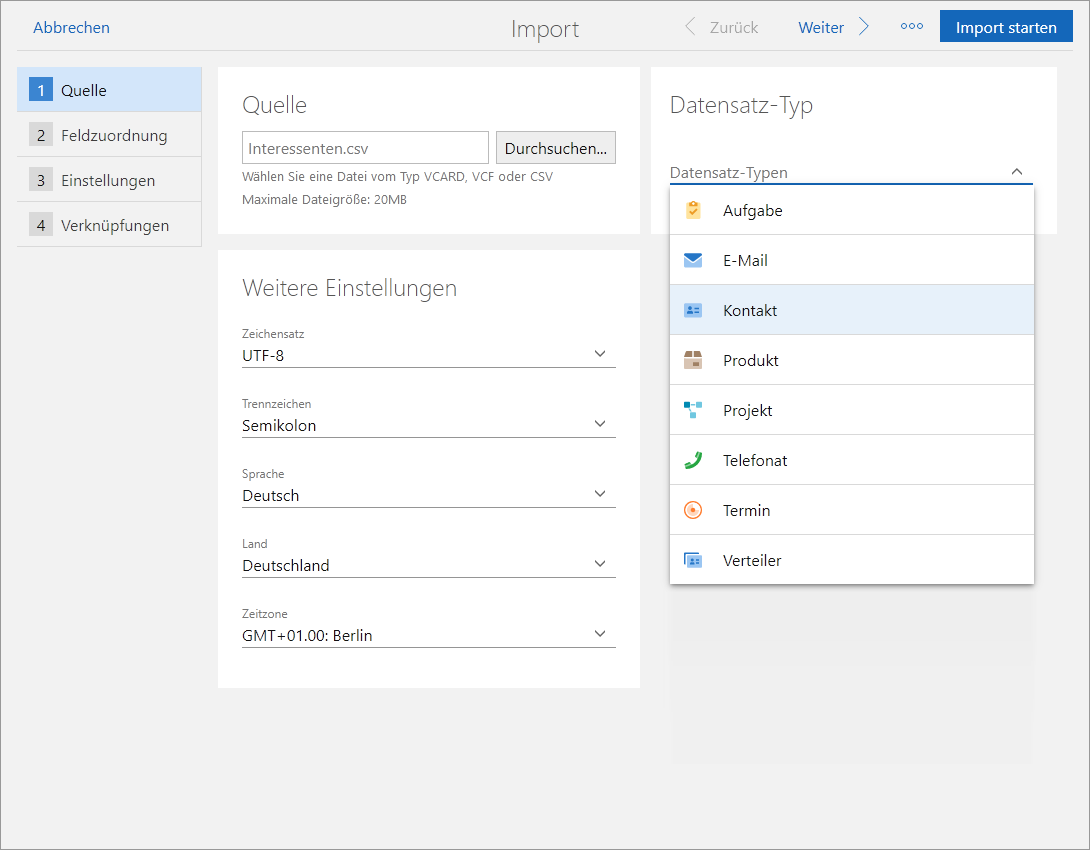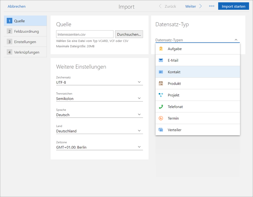 Quelle | Im Feld Quelle wählen Sie die Datei, die Sie importieren möchten. Für den Import von CSV-Dateien muss die Datei die Endung .csv haben und darf maximal 20 MB groß sein. |