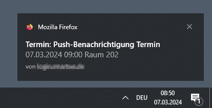 Wenn Sie für eine Aktivität eine Benachrichtigung eingestellt haben, versucht der Browser zum eingestellten Zeitpunkt eine Benachrichtigung zu senden. Wenn zu diesem Zeitpunkt die Benachrichtigungen nicht erlaubt sind, erhalten Sie stattdessen eine Information, dass die Benachrichtigungen zugelassen werden müssen. Wenn Sie keine Information erhalten, sind die Benachrichtigungen für den Browser oder für die Website möglicherweise grundsätzlich nicht erlaubt. Prüfen Sie ggf. in den Einstellungen des Browsers, ob Benachrichtigungen erlaubt sind.