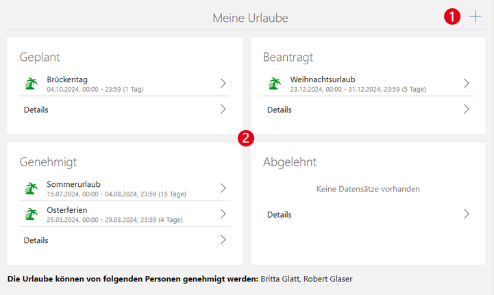 Bereits angelegte Datensätze werden in vier Blöcken angezeigt: Geplant, Beantragt, Genehmigt und Abgelehnt. Unterhalb dieser Blöcke wird angezeigt, wer die Urlaube des aktuell angemeldeten Benutzers genehmigen kann.