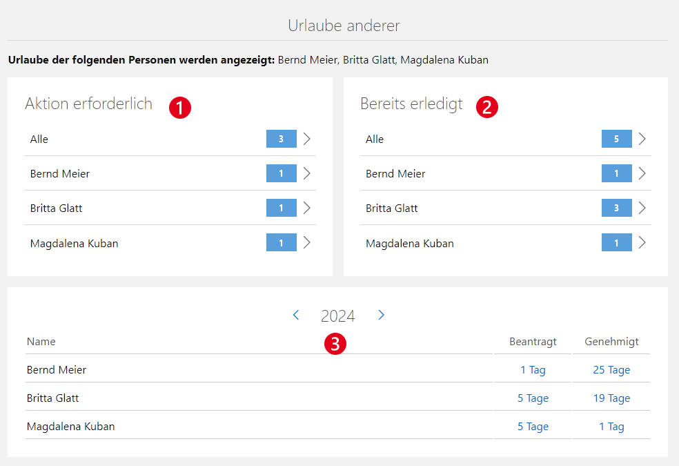 Der Block Aktion erforderlich enthält die Urlaube, die bisher nicht genehmigt oder abgelehnt wurden. Die Urlaube sind nach Benutzern sortiert und die Zahl zeigt an, wie viele Datensätze noch nicht bearbeitet wurden.