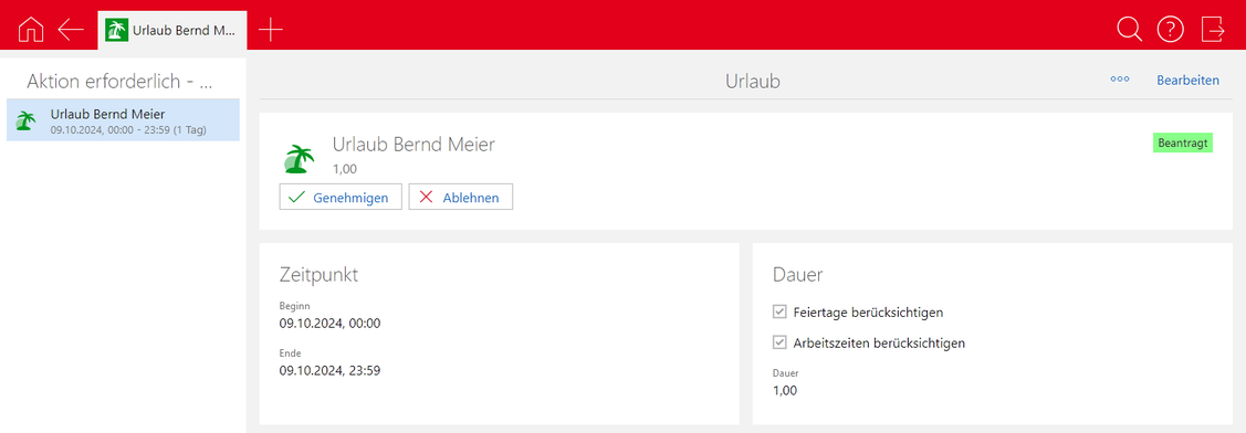 Wenn Sie über die entsprechenden Berechtigungen verfügen, können Sie einen Urlaub genehmigen oder ablehnen.