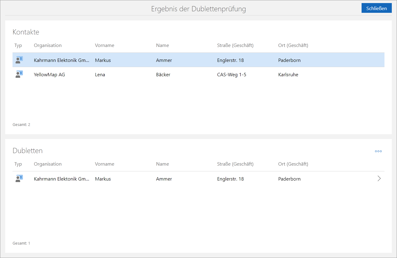 - Die Dublettenprüfung wird durchgeführt. Wenn Dubletten gefunden werden, wird das Fenster Ergebnis der Dublettenprüfung geöffnet.