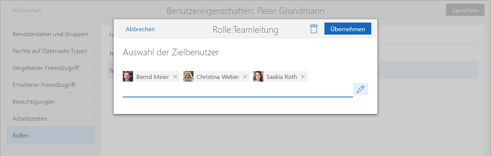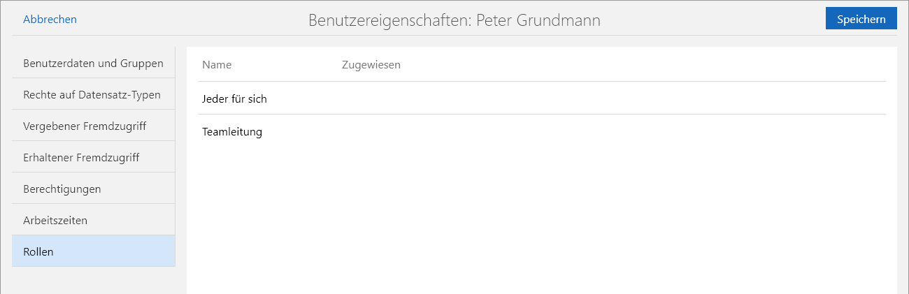 Rollen können Sie in der App Administration für Benutzer zuweisen. Dabei können Sie wählen, für welche Benutzer der jeweilige Rolleninhaber zuständig ist.