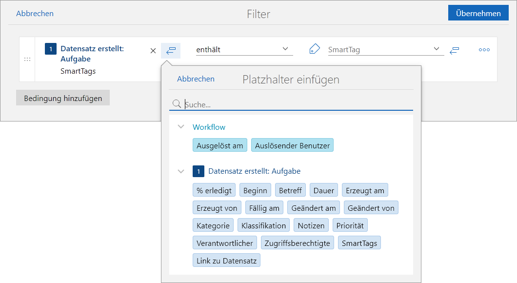 Mithilfe des Filters können Sie genauer festlegen, unter welchen Voraussetzungen der Workflow ausgelöst werden soll. Beispielsweise können Sie festlegen, dass der Workflow nur dann ausgelöst wird, wenn beim Anlegen eines Datensatzes ein bestimmtes SmartTag eingegeben wurde.