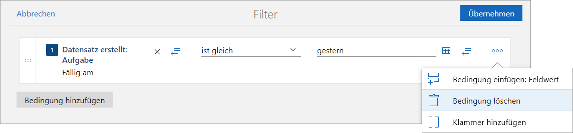 Der Filter können Sie einstellen, wenn Sie als Typ einen der folgenden Einträge gewählt hatten: Datensatz erstellt, Datensatz erstellt oder geändert, Datensatz geändert, Verknüpfung erstellt oder Verknüpfung gelöscht.