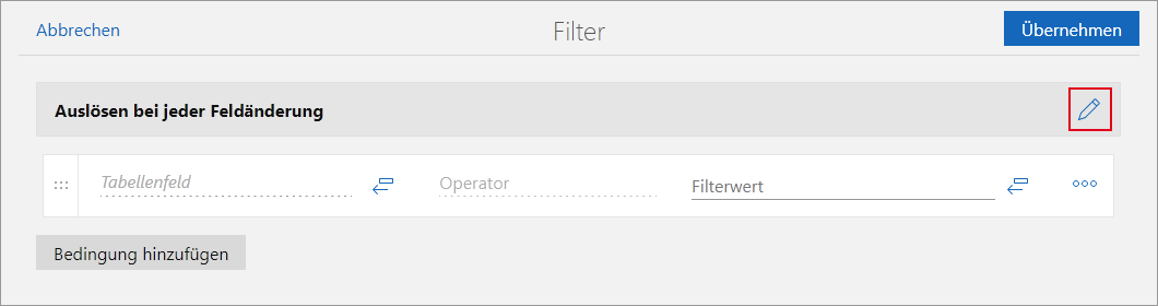 Auslösen bei jeder Feldänderung | Der Workflow wird immer dann ausgelöst, wenn ein beliebiges Feld geändert wurde. Zusätzlich gelten die weiteren Filtereinstellungen, falls vorhanden. |