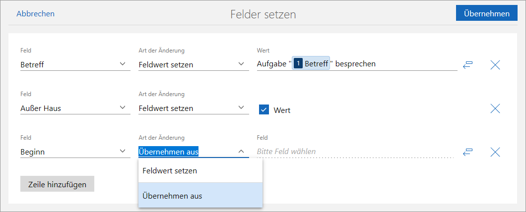 Platzhalter einfügen | Klicken Sie auf diese Schaltfläche, um einen oder mehrere Platzhalter zu wählen. Als Platzhalterquellen stehen Informationen aus dem Workflow und Felder aus Datensätzen zur Verfügung. Alle Datensätze, die im bisherigen Ablauf des Workflows bereits bekannt sind, können Platzhalterquellen sein. Pro Feld sind immer nur die Platzhalter verfügbar, die mit dem Feld der aktuellen Zeile kompatibel sind. Die Schaltfläche ist bei manchen Feldern erst dann verfügbar, wenn zuvor als Art der Änderung der Eintrag Übernehmen aus gewählt wurde. | |