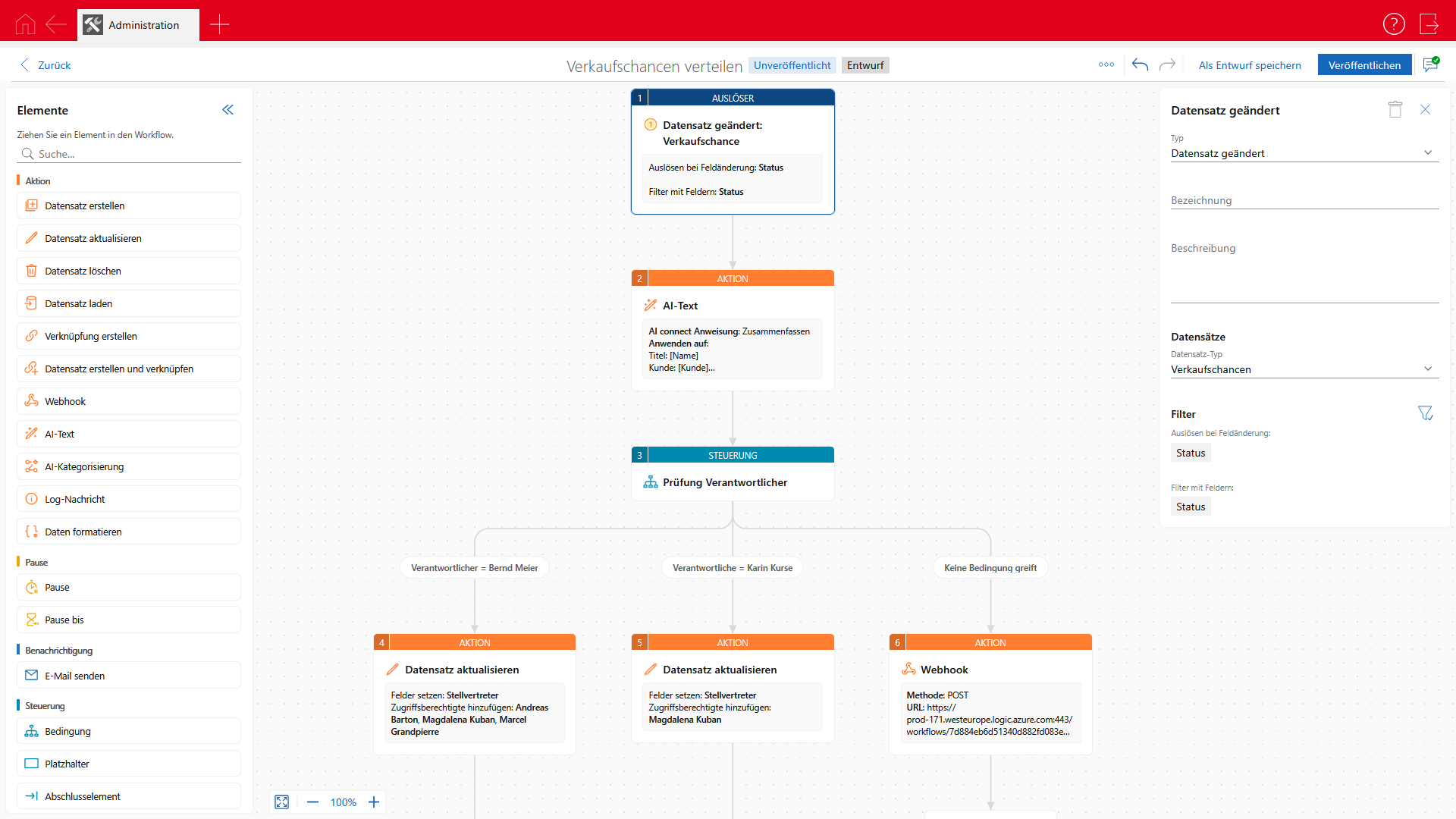 Ein Workflow wird immer in der Reihenfolge abgearbeitet, die Sie im Workflow-Designer festlegen. Ausgangspunkt ist immer der Auslöser, das Ende wird immer durch das Abschlusselement markiert.